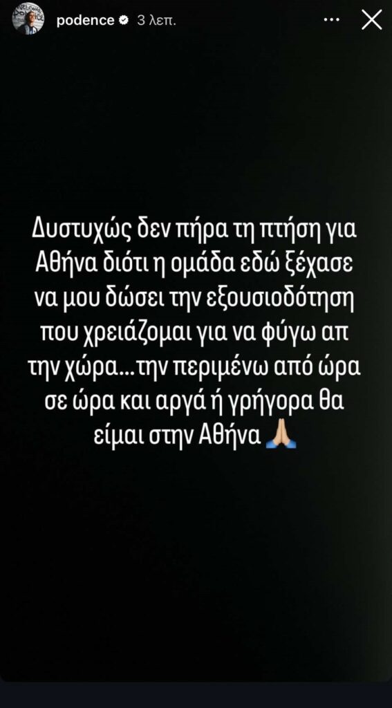 «Δυστυχώς δεν πήρα την πτήση για Αθήνα, διότι η ομάδα εδώ ξέχασε να μου δώσει την εξουσιοδότηση που χρειάζομαι για να φύγω από τη χώρα. Την περιμένω από ώρα σε ώρα και αργά ή γρήγορα θα είμαι στην Αθήνα»