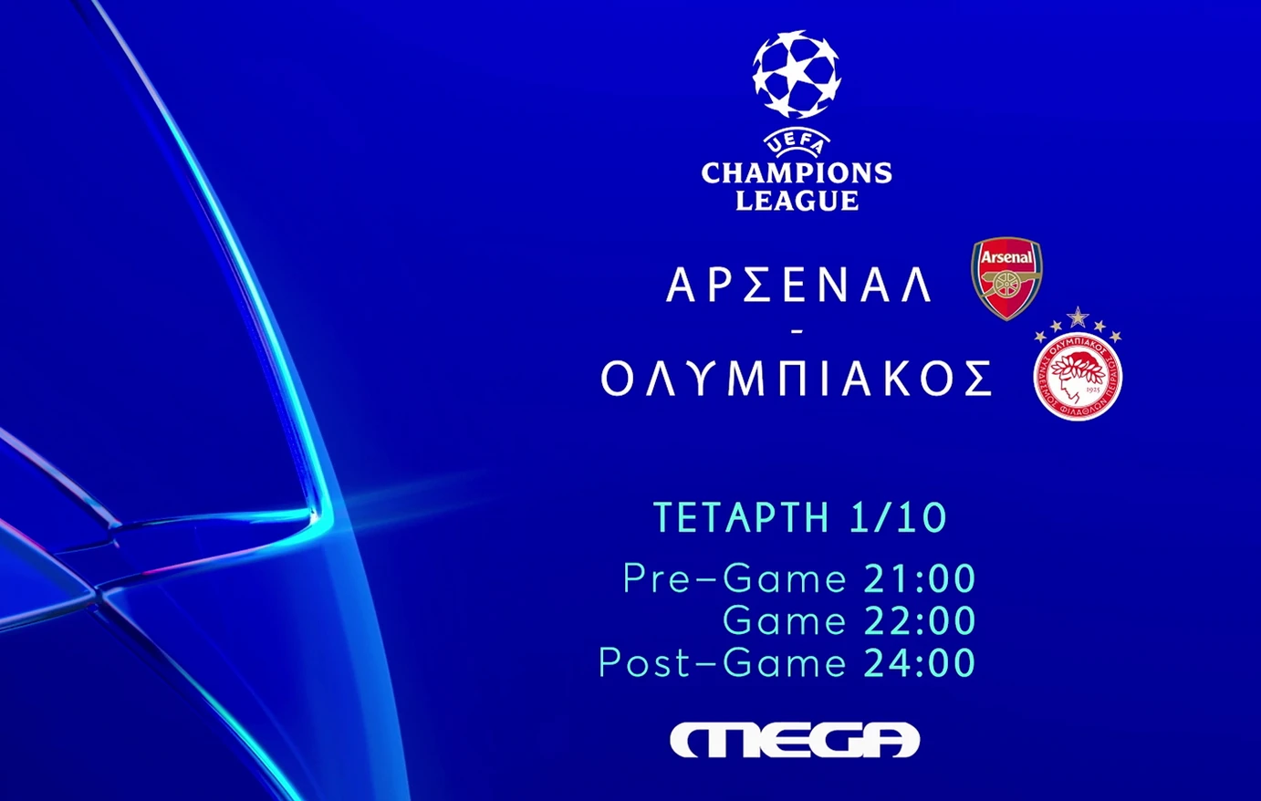 Το MEGA μεταδίδει αποκλειστικά την Τετάρτη 1η Οκτωβρίου, στις 22:00, τη μεγάλη αναμέτρηση της 2ης αγωνιστικής της League Phase του Champions League ανάμεσα στην Άρσεναλ και τον Ολυμπιακό, από το «Emirates Stadium».