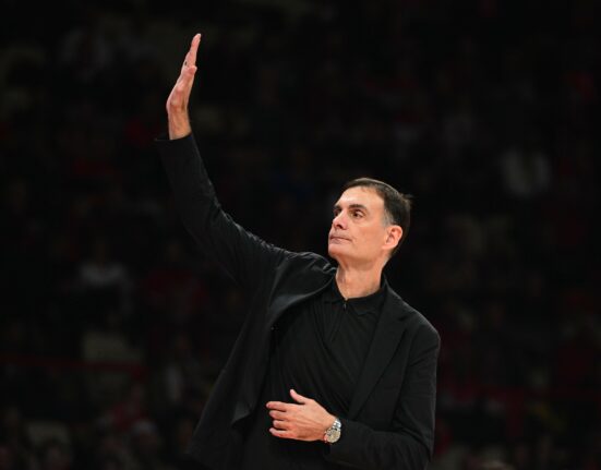 Ο Κώστας Παπανικολάου λίγο μετά την έναρξη της τρίτης περιόδου της αναμέτρησης του Ολυμπιακού με τη Βιλερμπάν για τη 17η αγωνιστική της EuroLeague