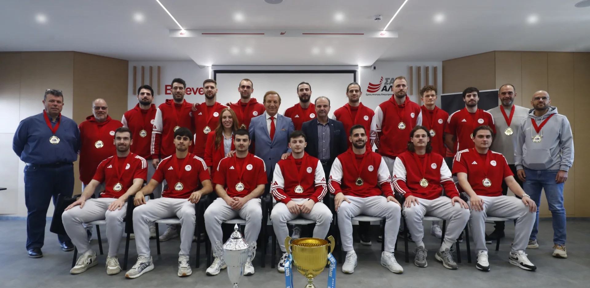 Σε μία λαμπρή εκδήλωση στον Πειραιά, οι άνθρωποι των ΣΑΕΚ ΑΛΦΑ, αφού έδωσαν το… σύνθημα για την κατάκτηση και του φετινού πρωταθλήματος, καθώς και τις ευχές τους για τη συνέχιση της ευρωπαϊκής πορείας στο EHF European Cup, απένειμαν μετάλλια στους αθλητές και στο προπονητικό επιτελείο της ομάδας χάντμπολ του Ολυμπιακού/Ομίλου Ξυνή, στον τεχνικό διευθυντή, Κωνσταντίνο Τσιλιμπάρη, στον τιμ μάνατζερ, Κωνσταντίνο Καραμπουρνιώτη και στον φροντιστή, Χρήστο Πουλιόπουλο.