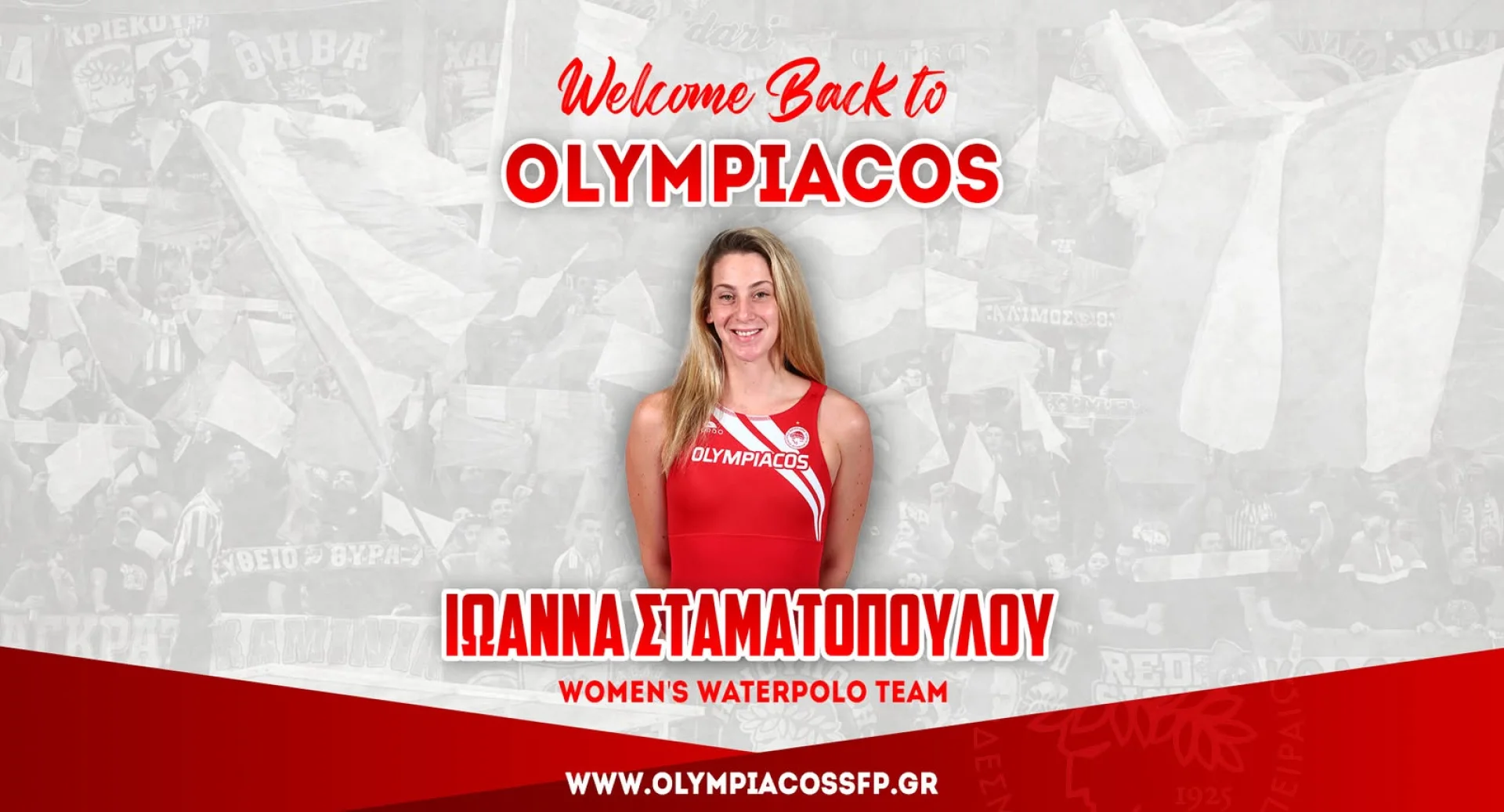 Ο ΟΛΥΜΠΙΑΚΟΣ Σ.Φ.Π. ανακοινώνει την έναρξη της συνεργασίας του με την Ιωάννα Σταματοπούλου. Η διεθνής τερματοφύλακας (γενν. 17/6/1998) υπέγραψε το νέο της συμβόλαιο και εντάσσεται στο ρόστερ της ομάδας πόλο Γυναικών του Θρύλου.