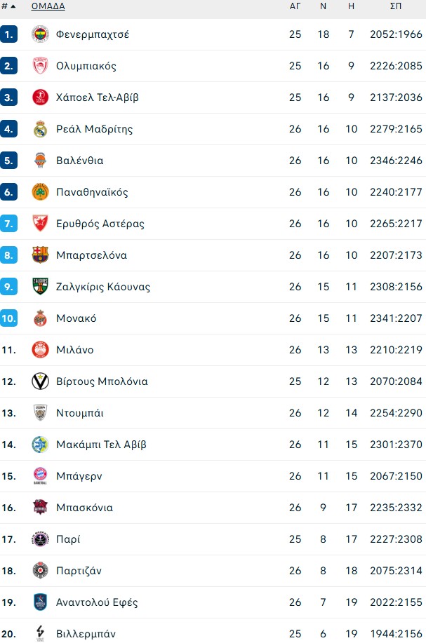 Στην κορυφή συνεχίζει να βρίσκεται η Φενέρμπαχτσε με 18-7, ωστόσο πίσω της έχει σχηματιστεί ένα πολυπληθές γκρουπ διεκδικητών, με επτά ομάδες να βρίσκονται στις 16 νίκες, γεγονός που διατηρεί ανοιχτά όλα τα σενάρια ενόψει της τελικής ευθείας της regular season.