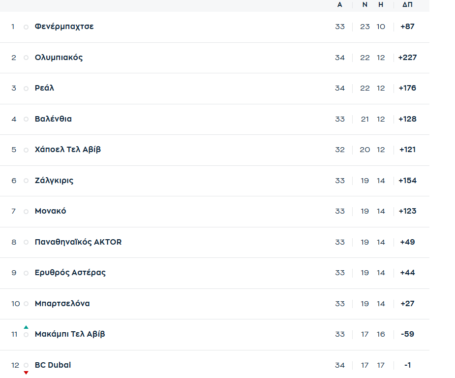 Στο ίδιο ρεκόρ βρίσκονται μετά από 34 αγωνιστικές στην κανονική περίοδο της EuroLeague Ρεάλ Μαδρίτης και Ολυμπιακός.