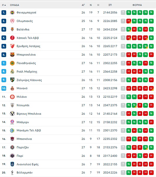 Δείτε πώς έχει διαμορφωθεί η βαθμολογία της EuroLeague μετά τα αποτελέσματα της Πέμπτης: