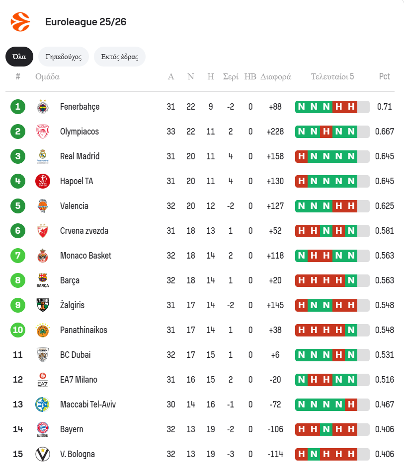 Η βαθμολογία της EuroLeague – Ο Ολυμπιακός στις 22 νίκες