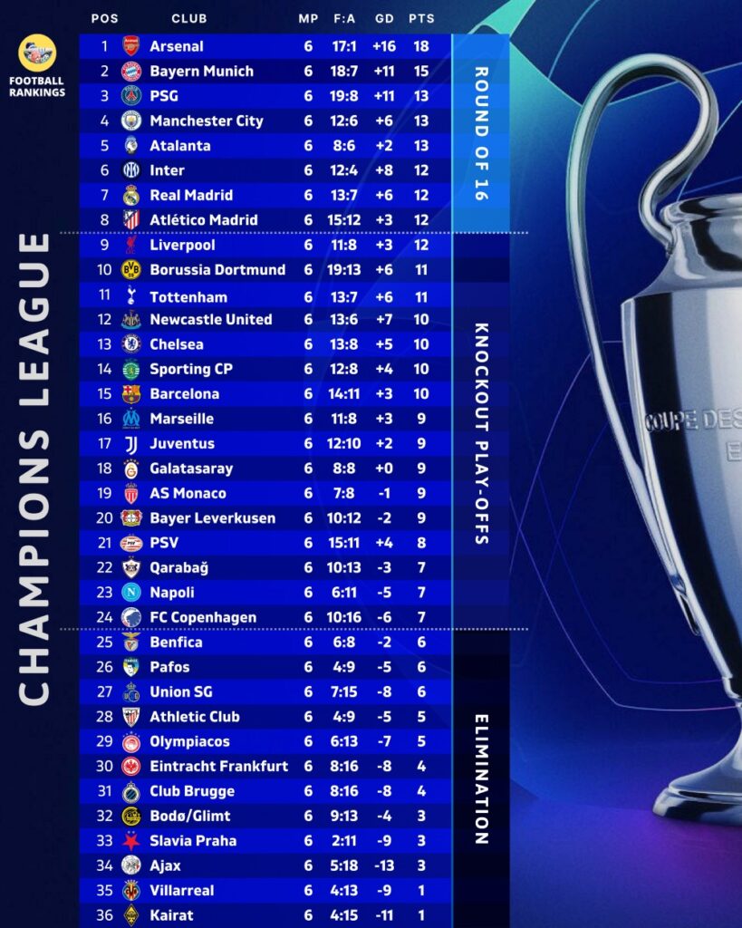 Η ολοκλήρωση της 6ης αγωνιστικής της League Phase το βράδυ της Τετάρτης (10/12) ξεκαθάρισε – προσωρινά – το τοπίο στη μεγάλη κούρσα για μια θέση στην επόμενη φάση του Champions League. Ο Ολυμπιακός, μετά τη σπουδαία εκτός έδρας νίκη στην Αστάνα, παρέμεινε δυνατά στο κόλπο της πρόκρισης.