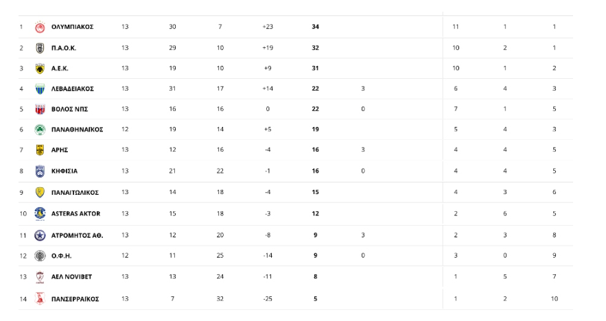 Ολυμπιακός, ΠΑΟΚ και ΑΕΚ συνέχισαν με νίκες και αύξησαν την απόστασή τους από τον Παναθηναϊκό, που ήρθε ισόπαλος 1-1 με την ΑΕΛ, ενώ εκκρεμεί και το παιχνίδι του «τριφυλλιού» με τον ΟΦΗ.