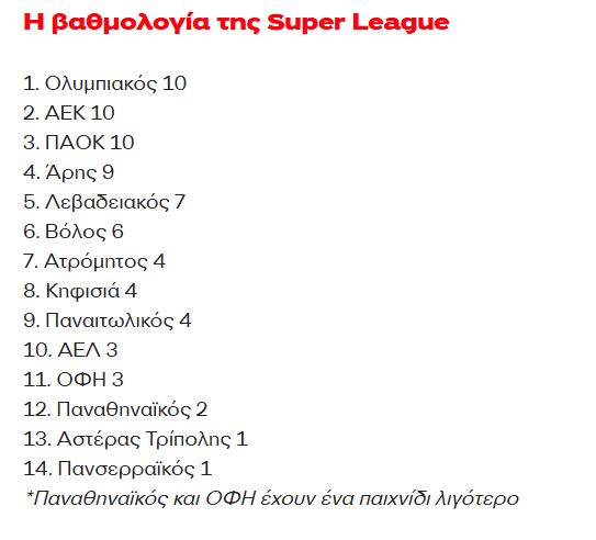 Ολυμπιακός, ΑΕΚ και ΠΑΟΚ έμειναν έτσι ισόβαθμοι στην κορυφή της βαθμολογίας, με τον Άρη να ανεβαίνει στο -1 από τους πρωτοπόρους και τον Παναθηναϊκό να μένει χαμηλά χωρίς νίκη στο πρωτάθλημα, με μόλις δύο βαθμούς σε τρεις αγώνες, αφού έχει αναβληθεί και το παιχνίδι του με τον ΟΦΗ.