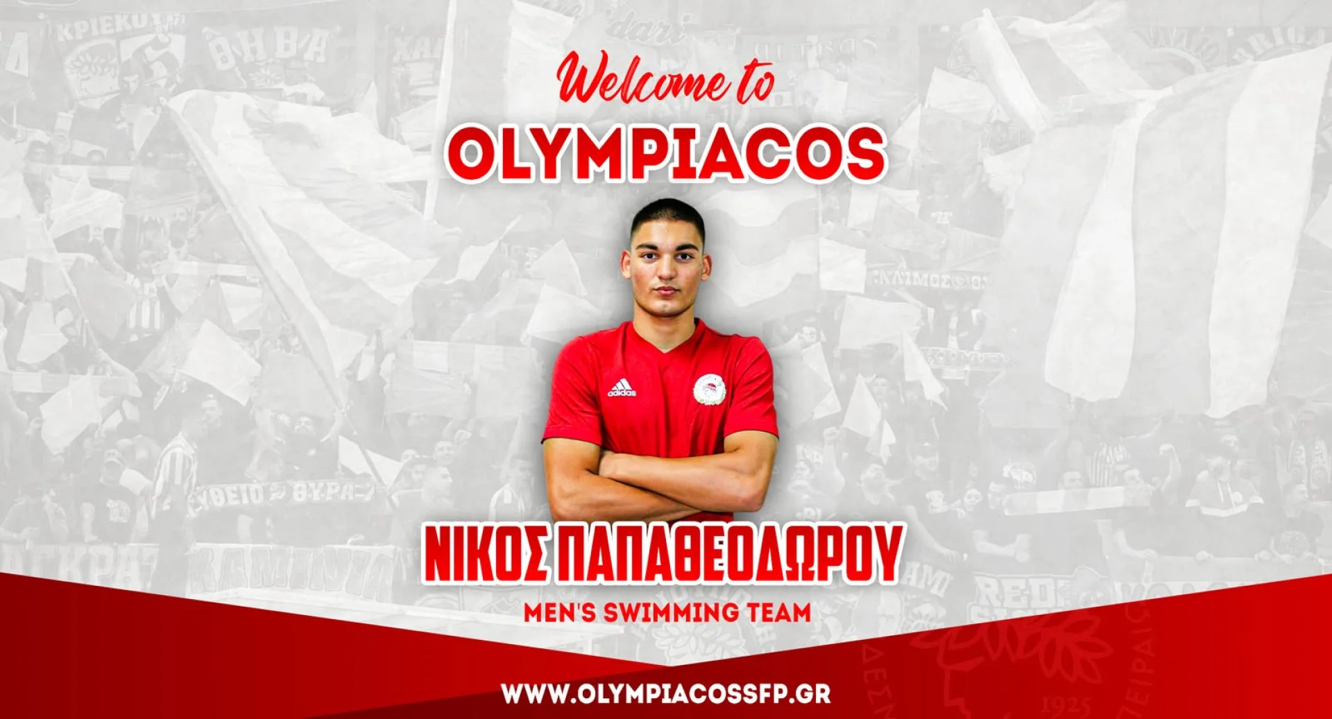 Ο ΟΛΥΜΠΙΑΚΟΣ Σ.Φ.Π. ανακοινώσε την έναρξη της συνεργασίας του με τον Νίκο Παπαθεοδώρου. Ο 16χρονος αθλητής (ημ. γέννησης 22/4/2009, 1,80μ.) εντάσσεται στην ομάδα κολύμβησης του συλλόγου.
