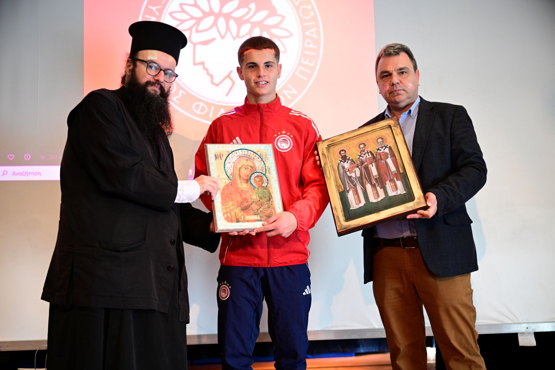 Ο Χρήστος Μουζακίτης παρέλαβε μια εικόνα της Παναγίας από τον Πνευματικό Σύμβουλο των Εκπαιδευτηρίων και μια εικόνα των Τριών Ιεραρχών, με τον κ. Αλφιέρη να απευθύνεται στον ποδοσφαιριστή μας, λέγοντάς του: «Επειδή βρίσκεσαι σε ένα χώρο εκπαιδευτικό, στα εκπαιδευτήρια της Ιεράς Μητροπόλεως Πειραιώς, που φροντίζουν να χτίζουν χαρακτήρες, που φροντίζουν με αίσθημα ευθύνης να μεταλαμπαδεύουν τη γνώση, δημιουργώντας προϋποθέσεις έτσι ώστε να μην σβήνουν οι αξίες και τα ιδανικά του έθνους και του λαού, σου προσφέρουμε ως ελάχιστο δείγμα ευγνωμοσύνης για τη σημερινή σου παρουσία την εικόνα των Τριών Ιεραρχών, που είναι οι προστάτες της εκπαίδευσης».