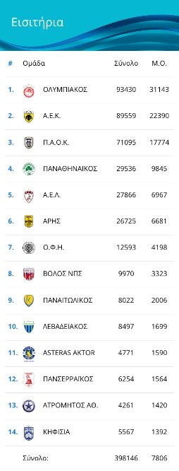 • ΠΑΟΚ: 71.095 εισιτήρια, μέσος όρος 17.774