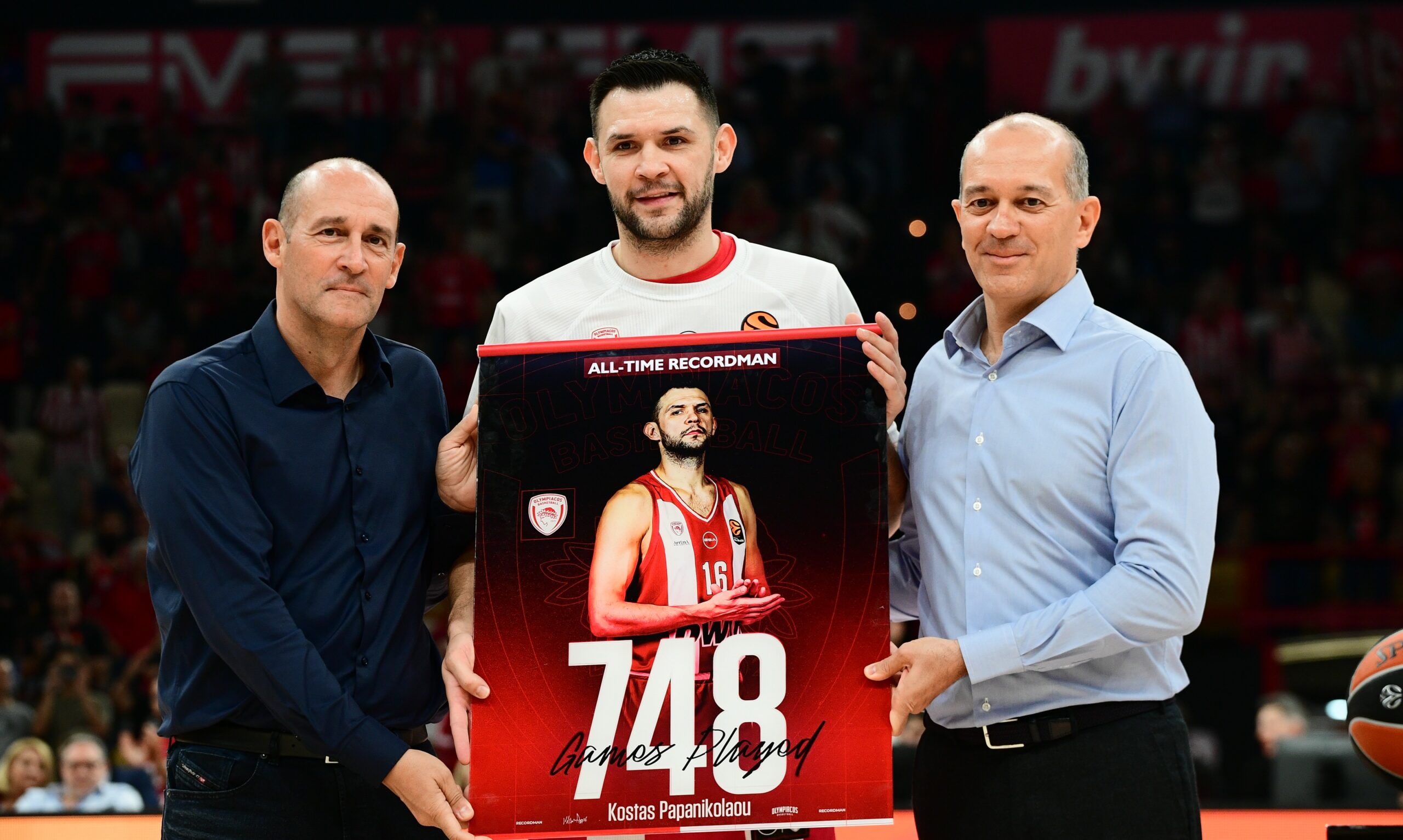 Σε μια ιδιαίτερη και συγκινητική στιγμή πριν από τον αγώνα του Ολυμπιακού με τη Ντουμπάι BC, οι Παναγιώτης και Γιώργος Αγγελόπουλος τίμησαν τον αρχηγό των ερυθρολεύκων, Κώστα Παπανικολάου, για το μοναδικό ρεκόρ συμμετοχών στην ιστορία της ομάδας.