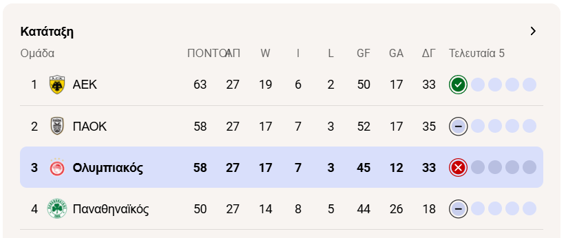 Πράγματι, η Ένωση νίκησε 1-0 τον Ολυμπιακό στο «Γ. Καραϊσκάκης» και τον άφησε στο -5 από την κορυφή, παίρνοντας ισχυρό προβάδισμα στη μάχη του τίτλου.