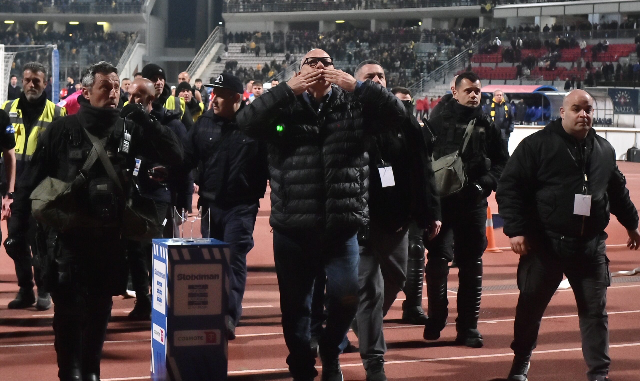 Ο Πρόεδρος του ΝΠΣ Βόλος Αχιλλέας Μπέος, θέλησε να ευχαριστήσει τους οπαδούς της ΑΕΚ για την ατμόσφαιρα τους στέλνοντας φιλάκια.