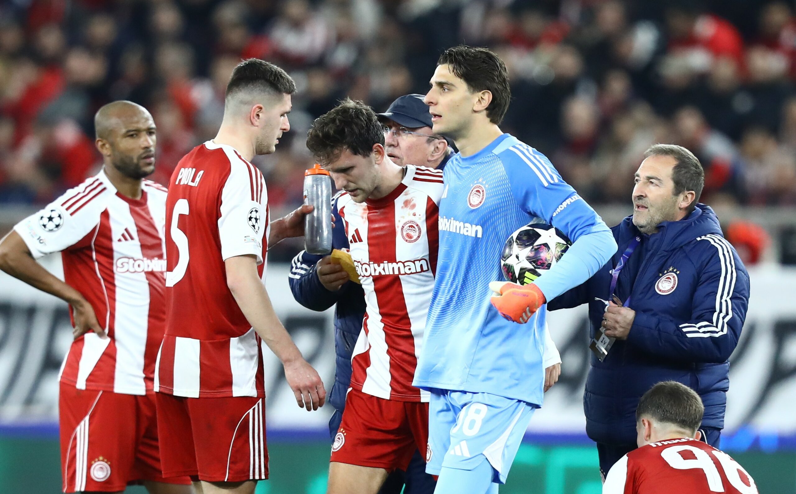 Σε μια διεκδίκηση της μπάλας οι δύο στόπερ του Ολυμπιακού, Πιρόλα και Ρέτσος, δεν είδαν ο ένας τον άλλο και συγκρούστηκαν σφοδρά. Σωριάστηκαν στο έδαφος με αίματα στο πρόσωπο και οι δύο.