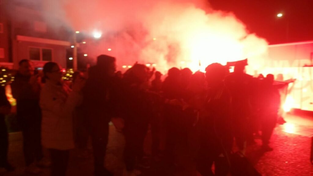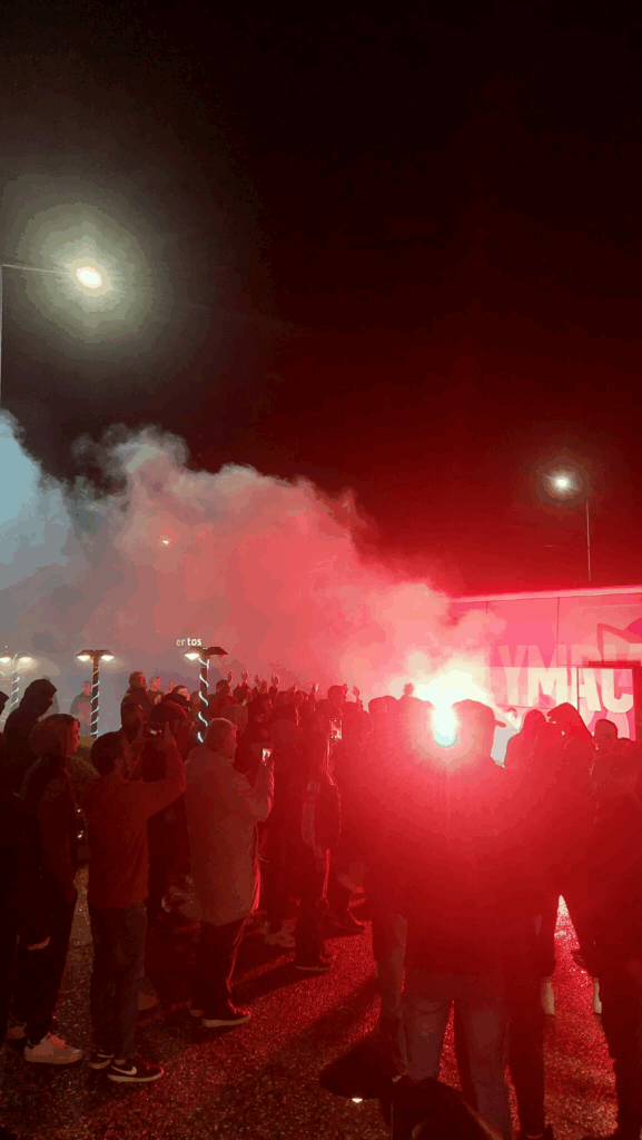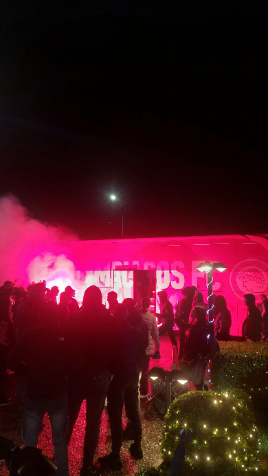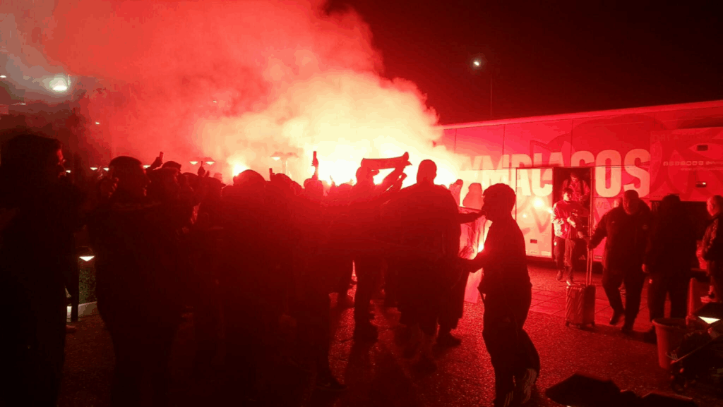 Παρά τη συνεχή βροχή, ο κόσμος δεν πτοήθηκε, παραμένοντας στο σημείο για να αποθεώσει την ομάδα και να δώσει ώθηση πριν το σημαντικό παιχνίδι. Η νύχτα «κοκκίνισε» από τα συνθήματα και τον ενθουσιασμό των φίλων του Ολυμπιακού, οι οποίοι έδειξαν για ακόμη μία φορά τη στήριξή τους.